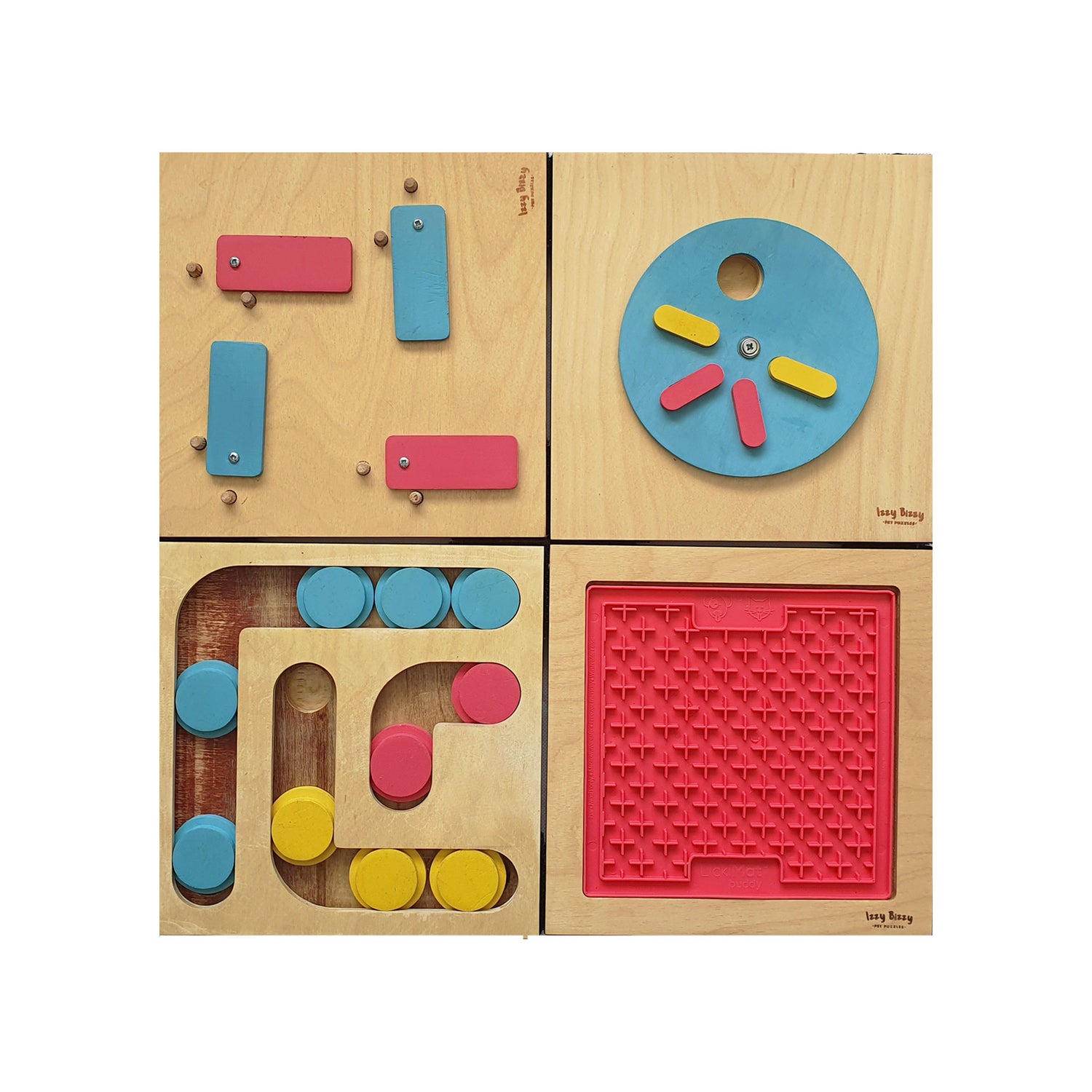 This 4 piece wooden pet puzzle is the ultimate boredom buster and an excellent choice for keeping your dog's brain active. Each game can be used individually or you can connect them together for a tougher, longer, and more durable game for your dog!